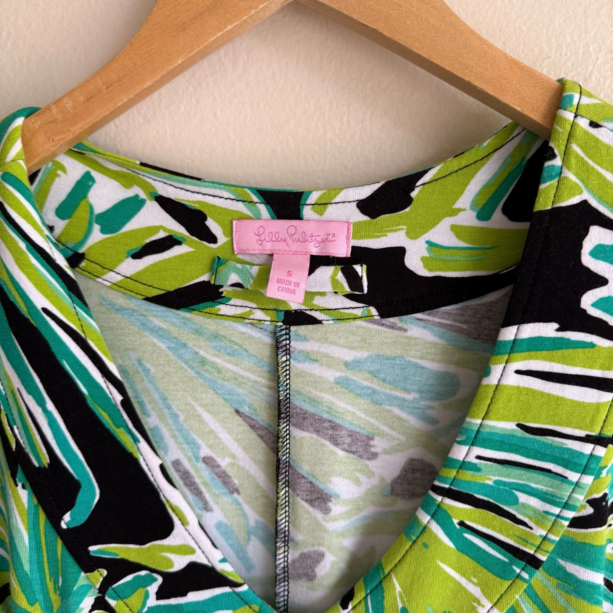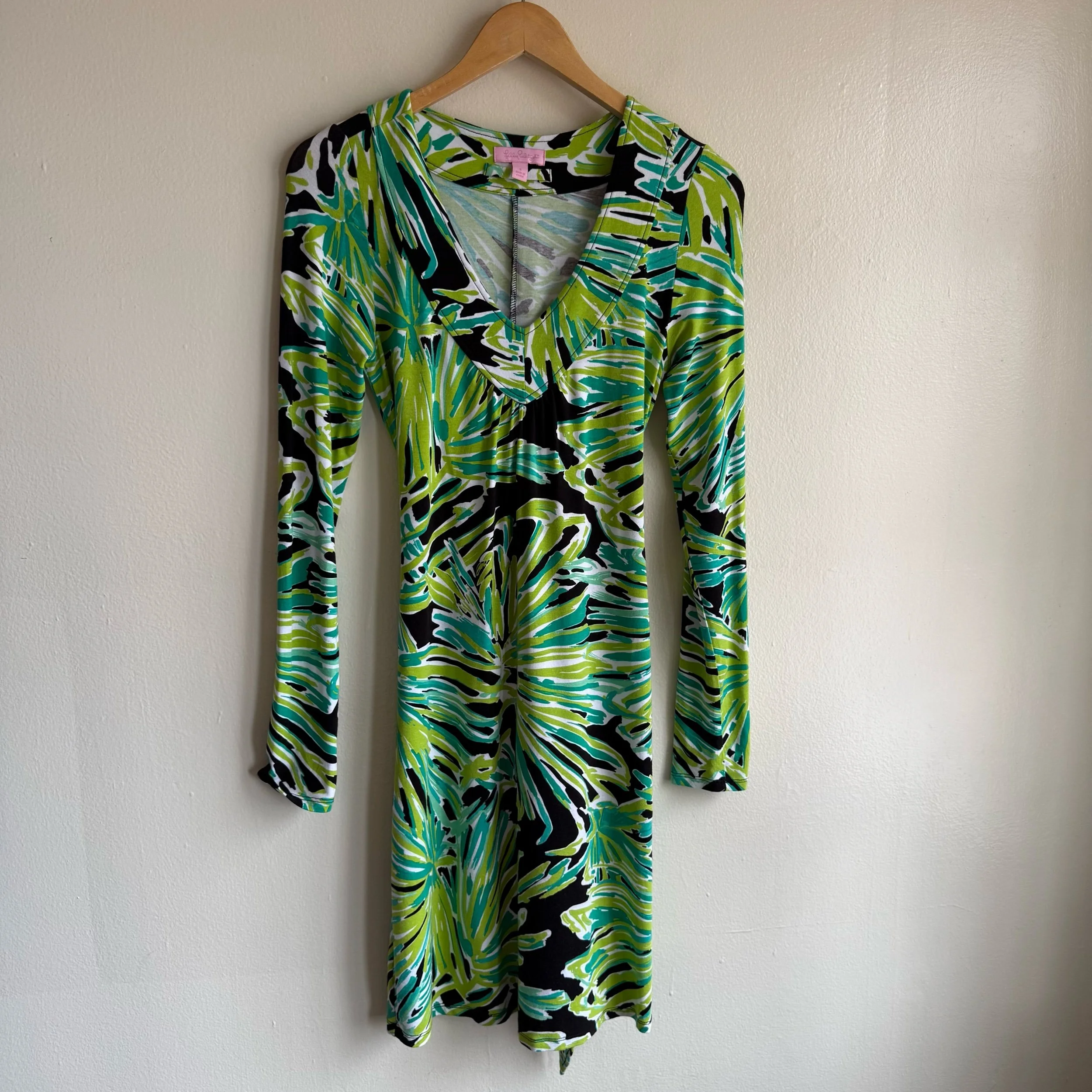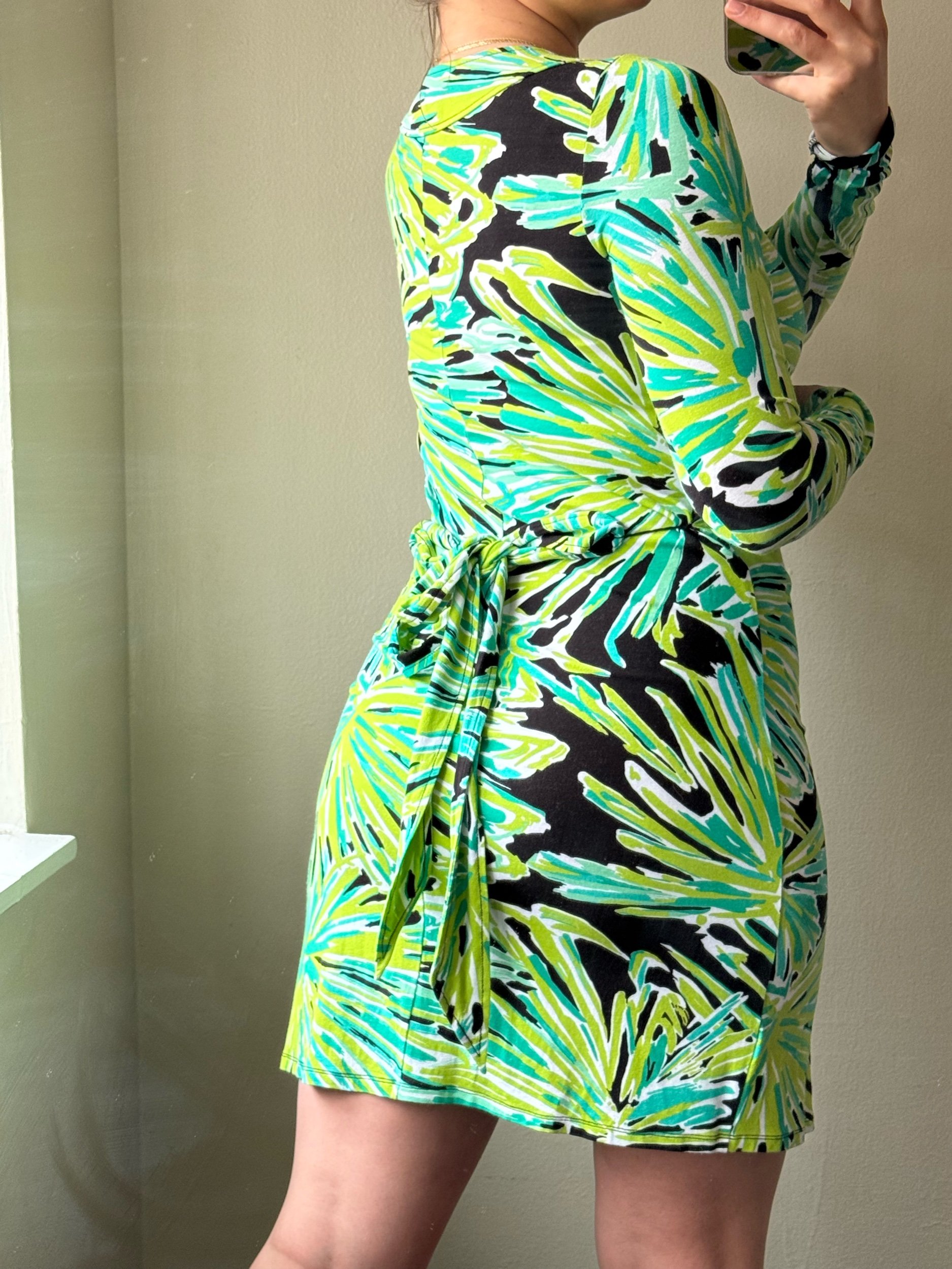 Lilly Pulitzer black & green plant printed long sleeve v neck dress with a belt that can be tied in the front or the back.