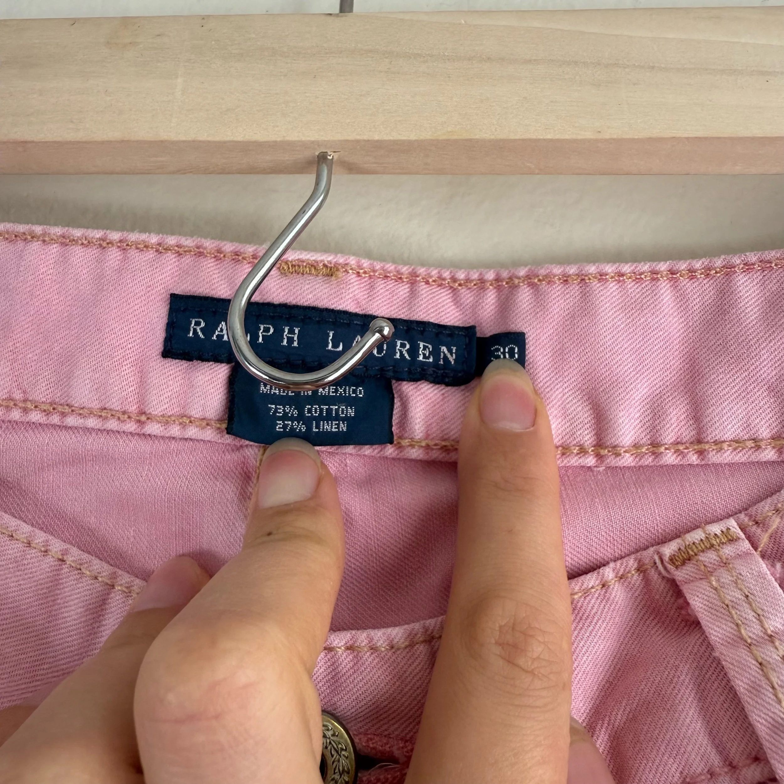 Ralph Lauren pink ultra low rise slim cut cotton & linen blend pants. Featuring an equestrian RL logo patch.