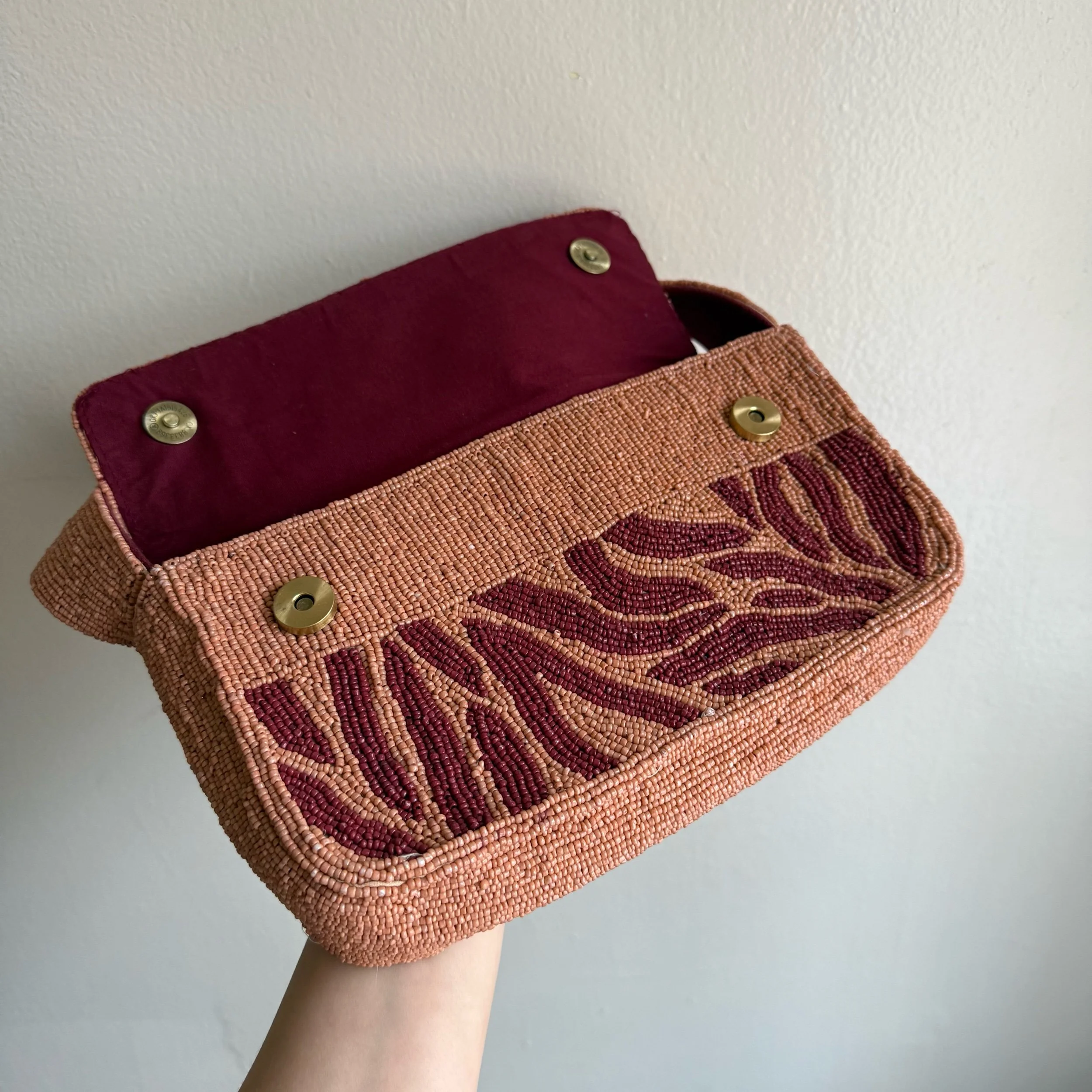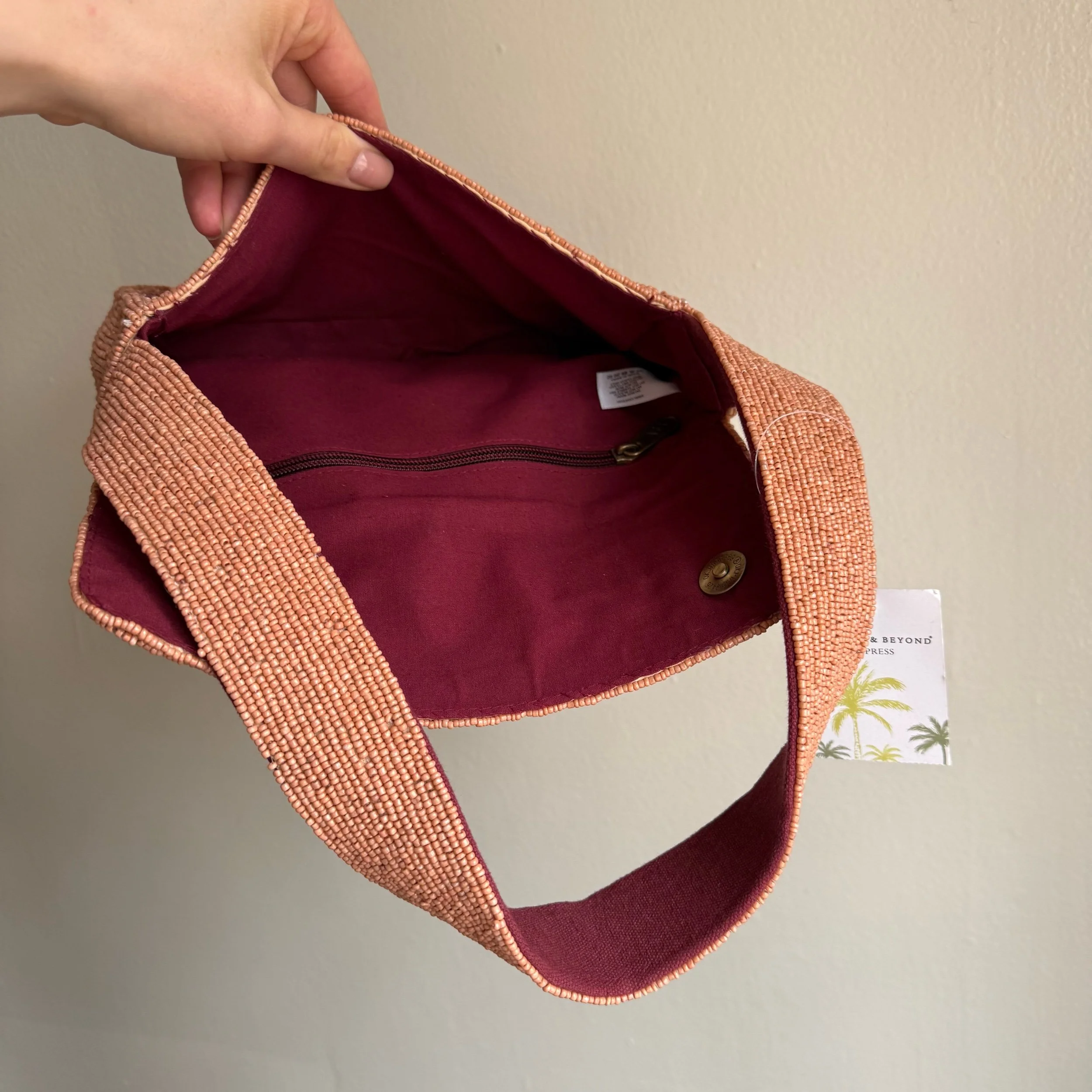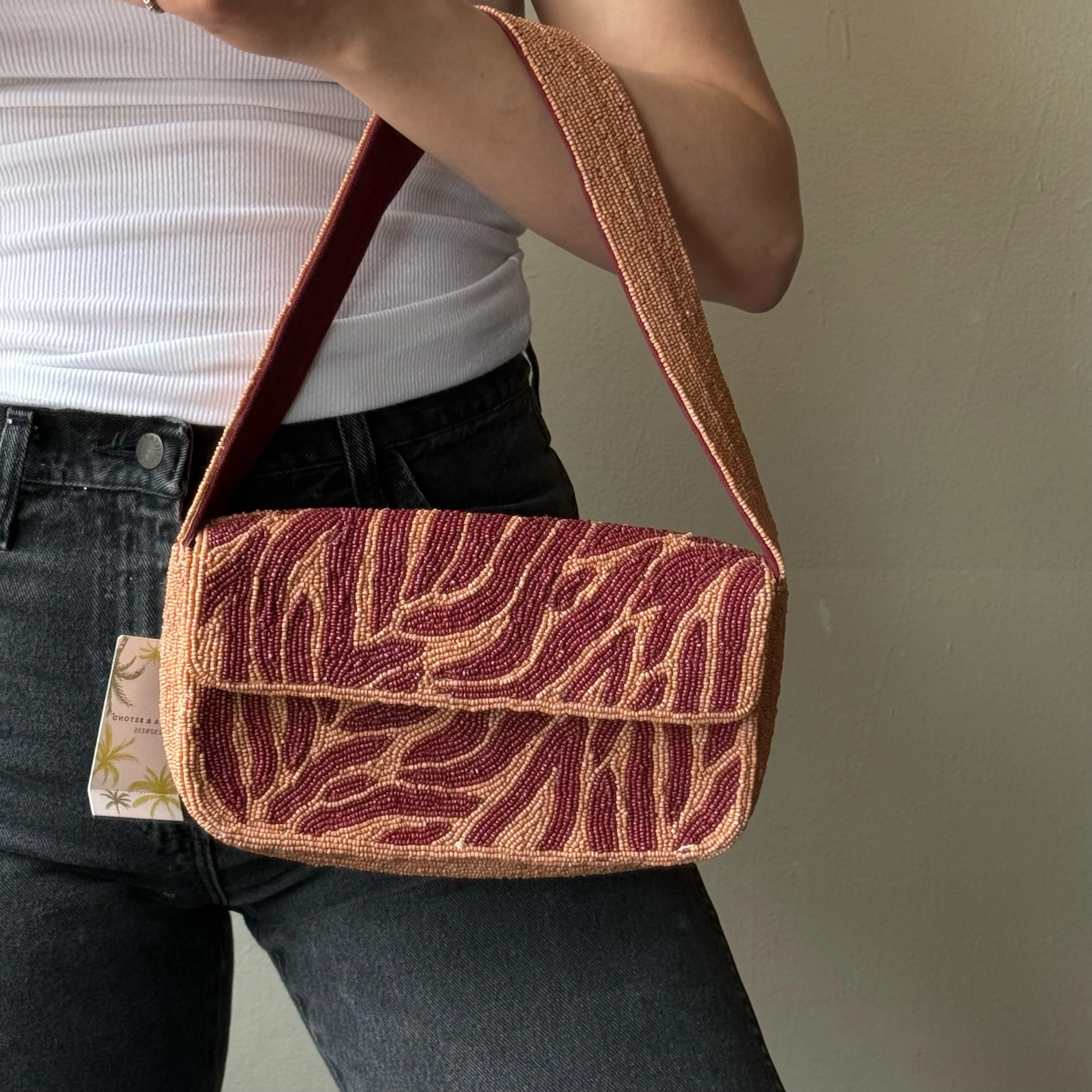 Shop › Beaded Bag Image 1 of 7 Image 2 of 7 Image 3 of 7 Image 4 of 7 Image 5 of 7 Image 6 of 7 Image 7 of 7 Beaded Bag $59.00 America & Beyond zebra beaded shoulder bag.• about 10x6x2 inches •hand made in India•100% cotton interior Add To Cart Added! America & Beyond zebra beaded shoulder bag.• about 10x6x2 inches •hand made in India•100% cotton interior