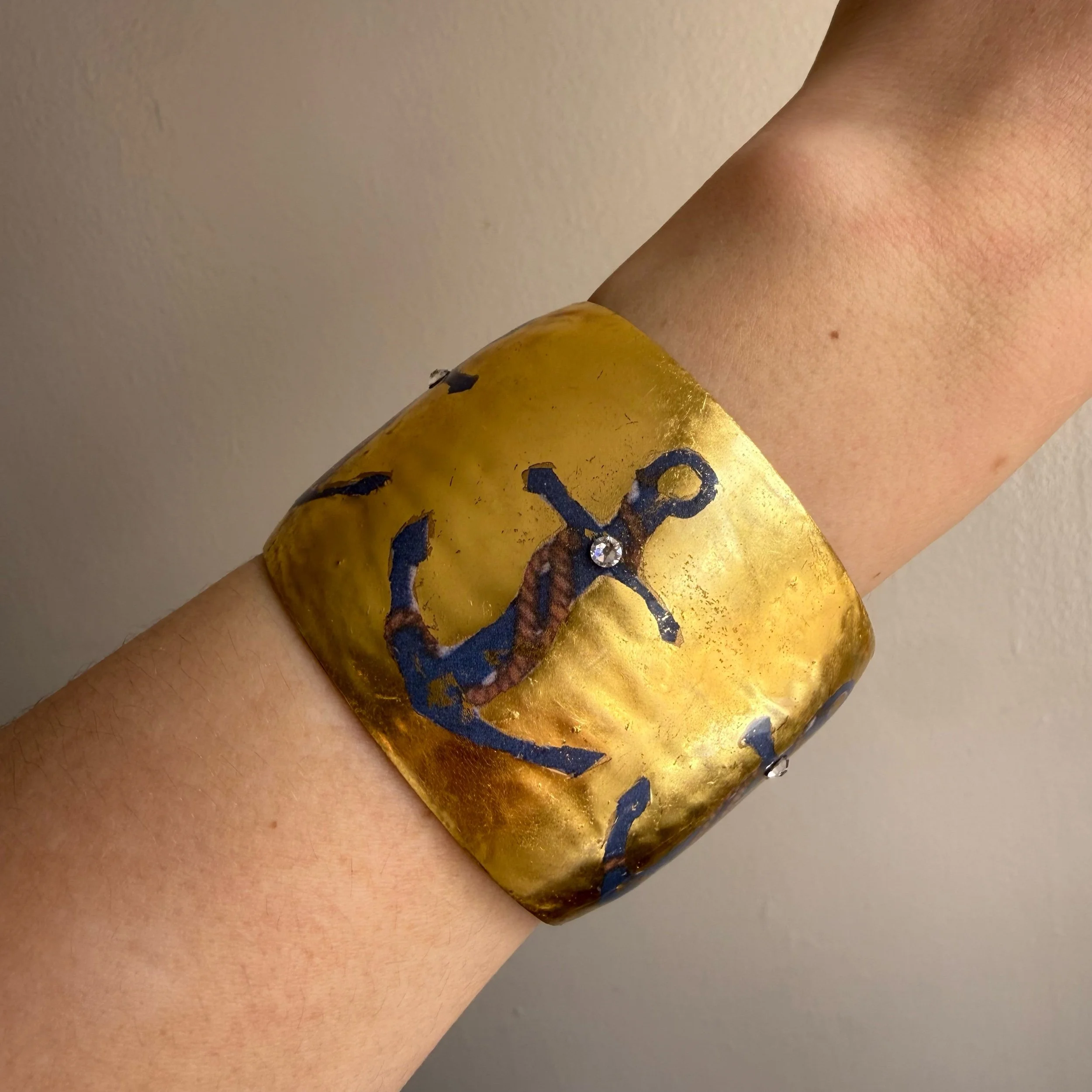 Shop › Evocateur Cuff Image 1 of 6 Image 2 of 6 Image 3 of 6 Image 4 of 6 Image 5 of 6 Image 6 of 6 Evocateur Cuff $95.00 Evocateur gold hammered cuff with 3 painted anchors that have a single “diamond” on each.•one size Add To Cart Added! Evocateur gold hammered cuff with 3 painted anchors that have a single “diamond” on each.•one size