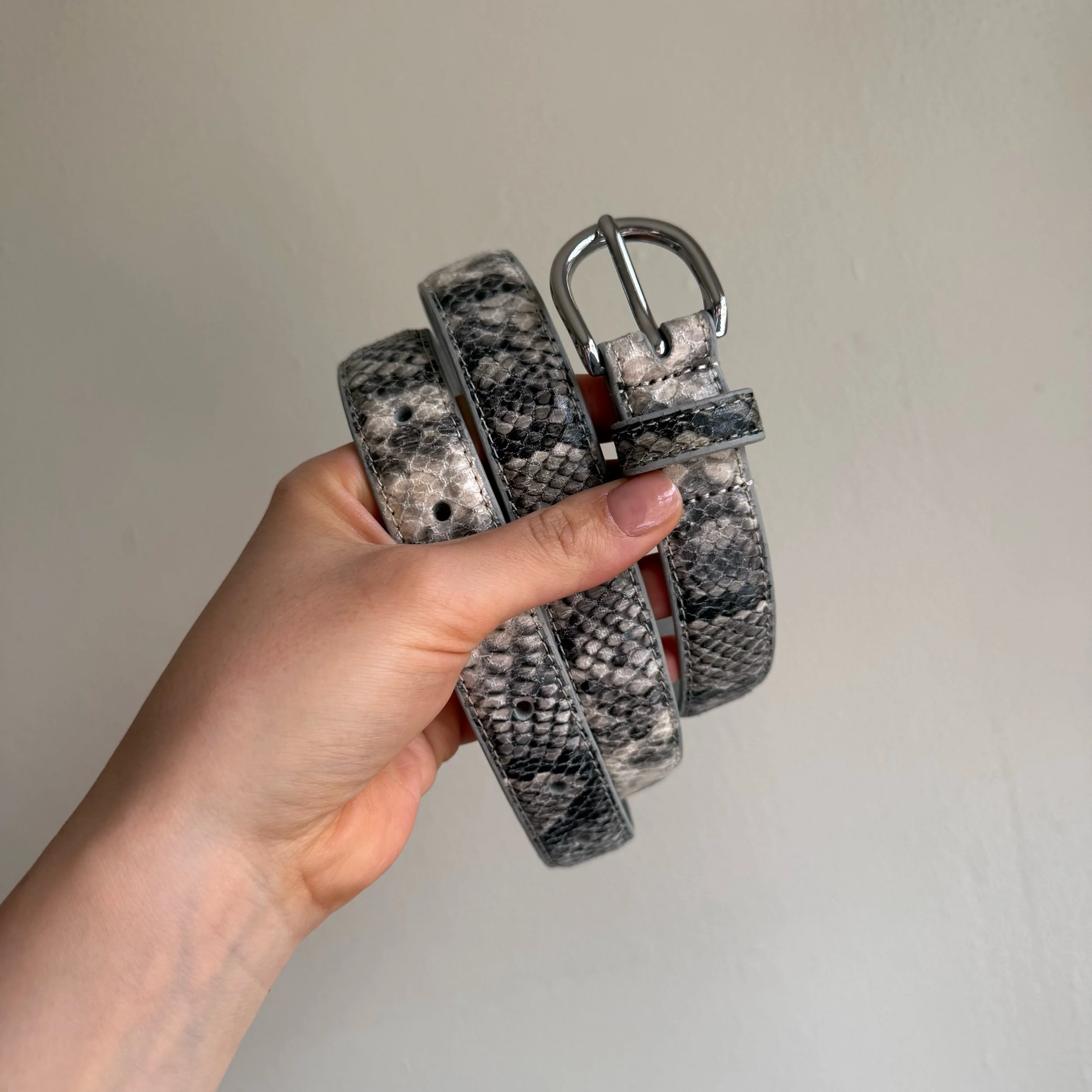 Shop › Snake Print Belt Image 1 of 5 Image 2 of 5 Image 3 of 5 Image 4 of 5 Image 5 of 5 Snake Print Belt $25.00 Vintage snake print belt with silver hardware. •size medium (32.5-37.5 inches)•genuine leather •unisex Add To Cart Added! Vintage snake print belt with silver hardware. •size medium (32.5-37.5 inches)•genuine leather •unisex