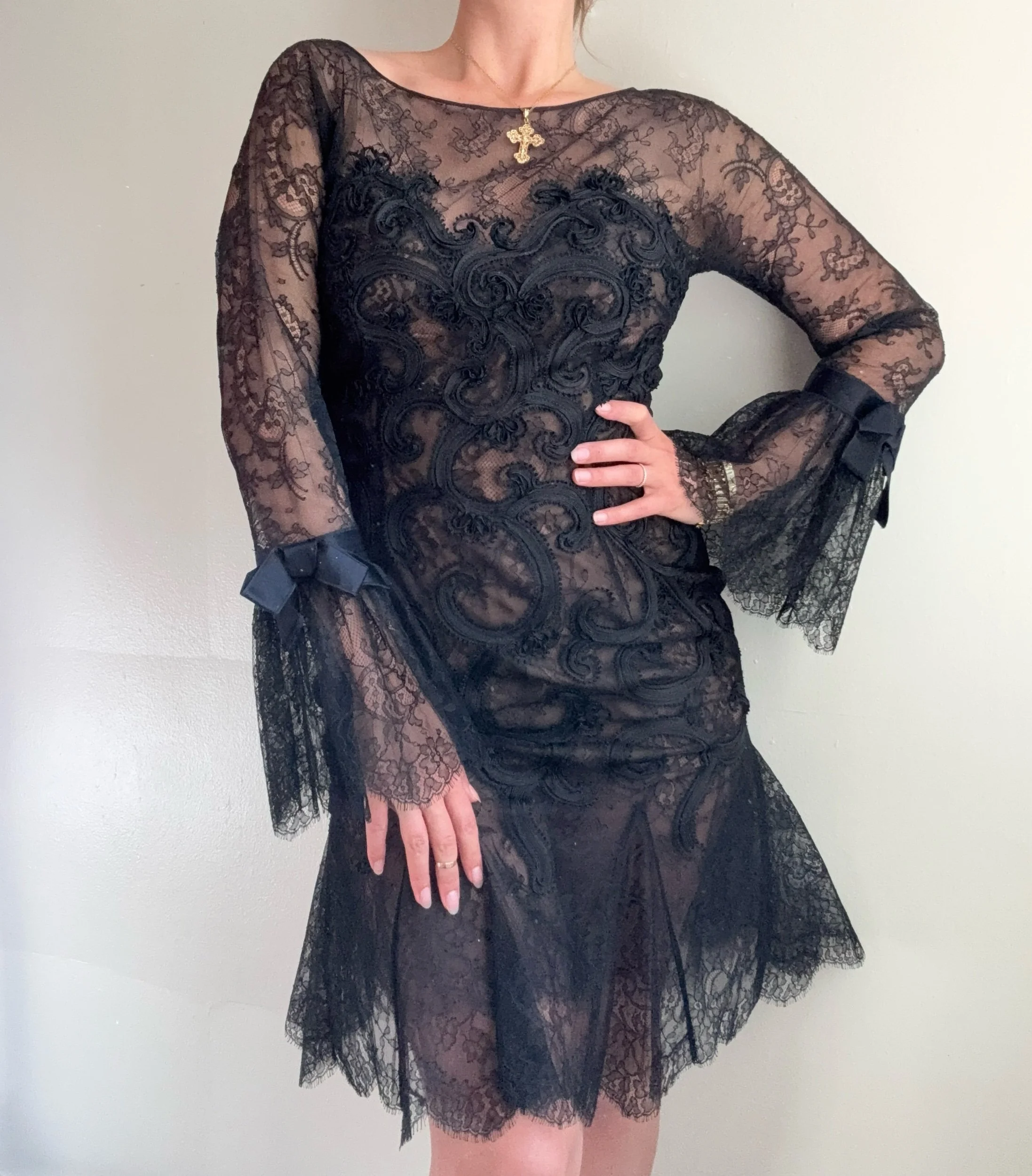 Vintage Oscar de la Renta Guipure black lace cocktail dress with 100% silk lining, satin bows, key hole slit back, pleats on the skirt and bell sleeves.