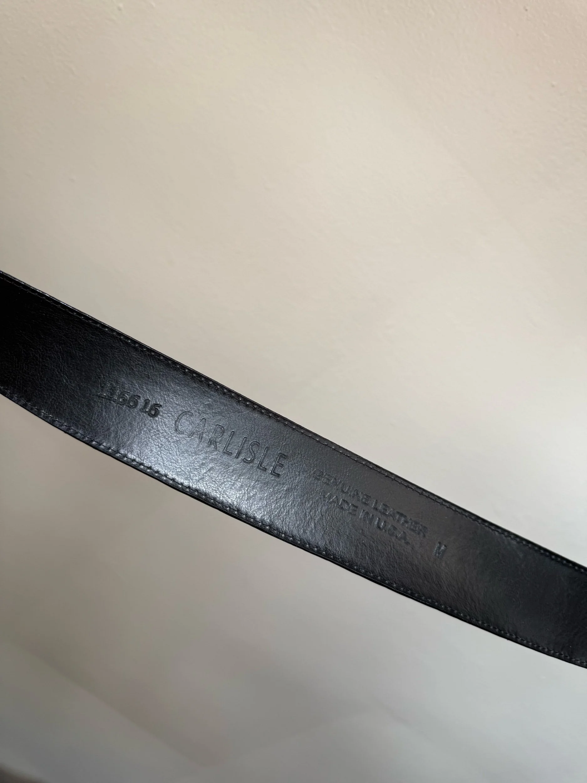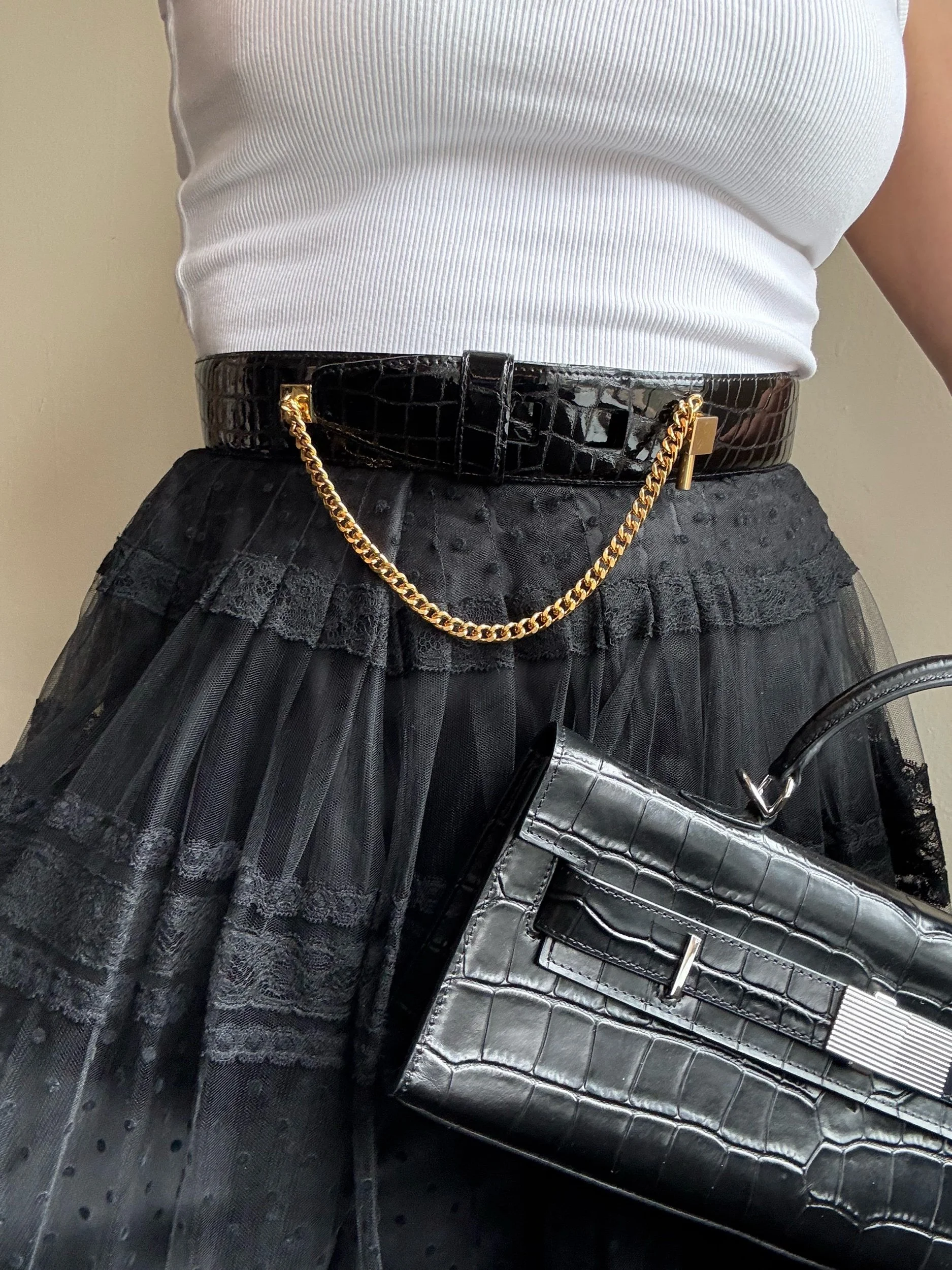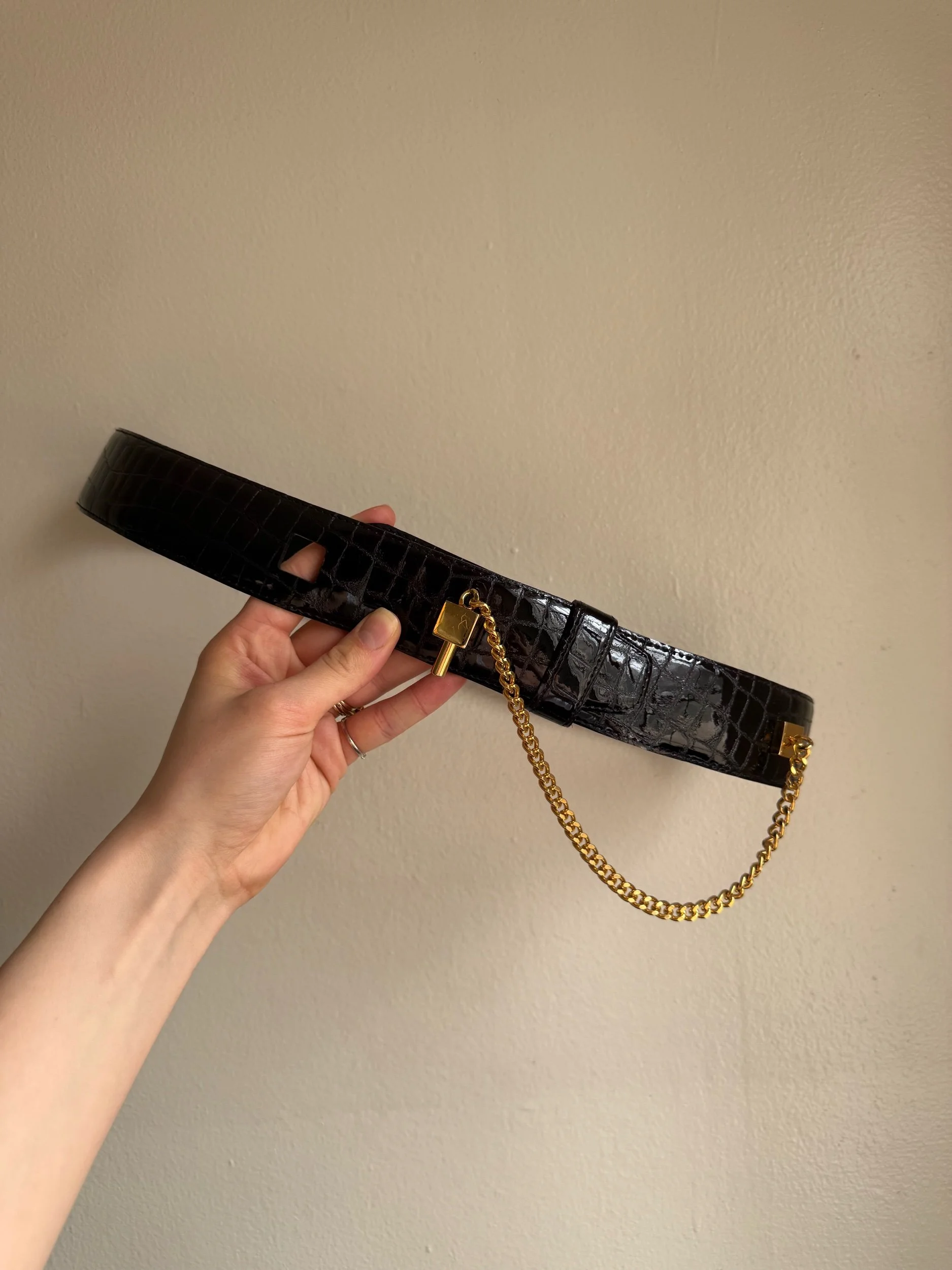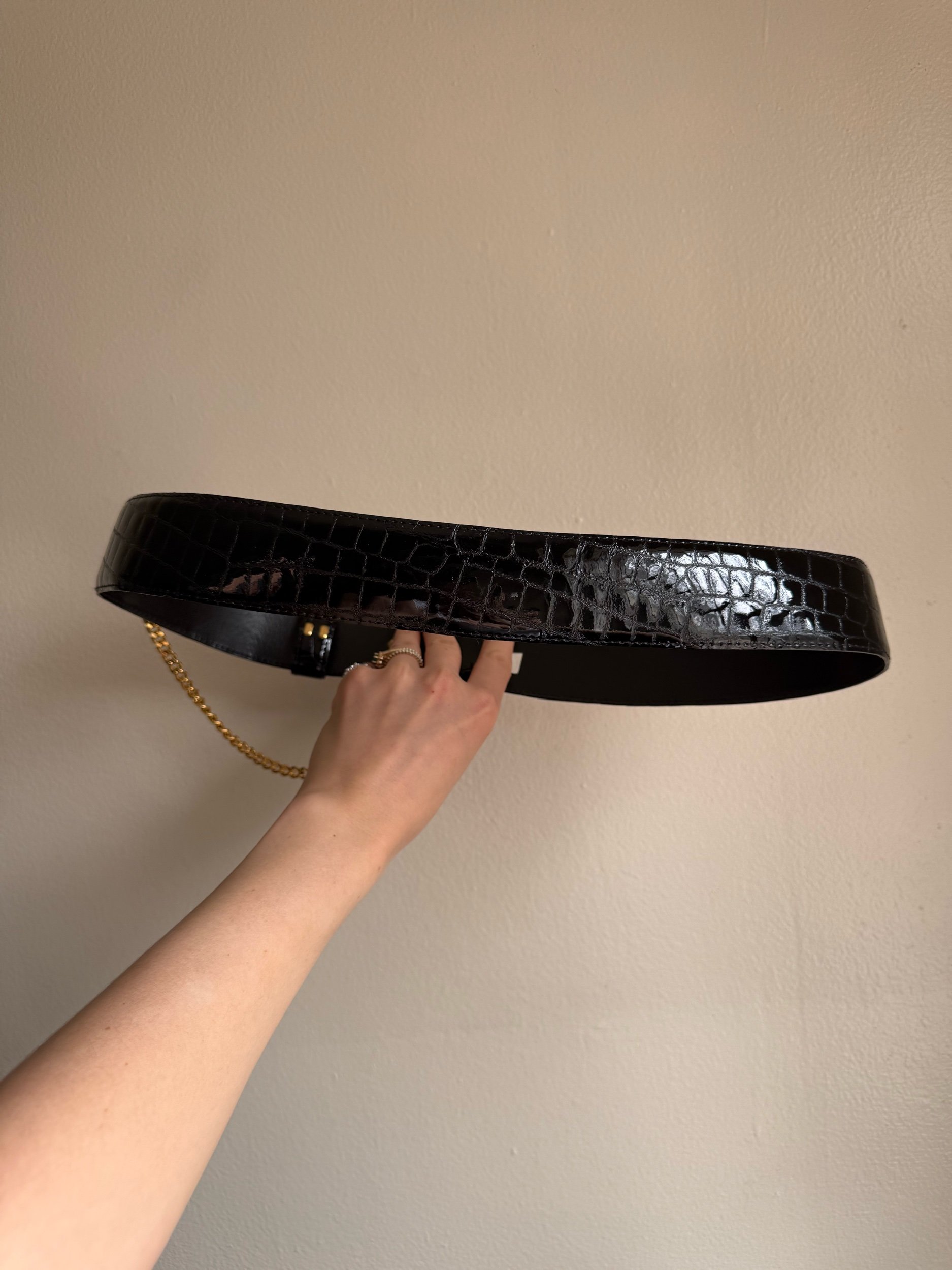Carlisle black patent crocodile embossed leather belt with gold hardware.