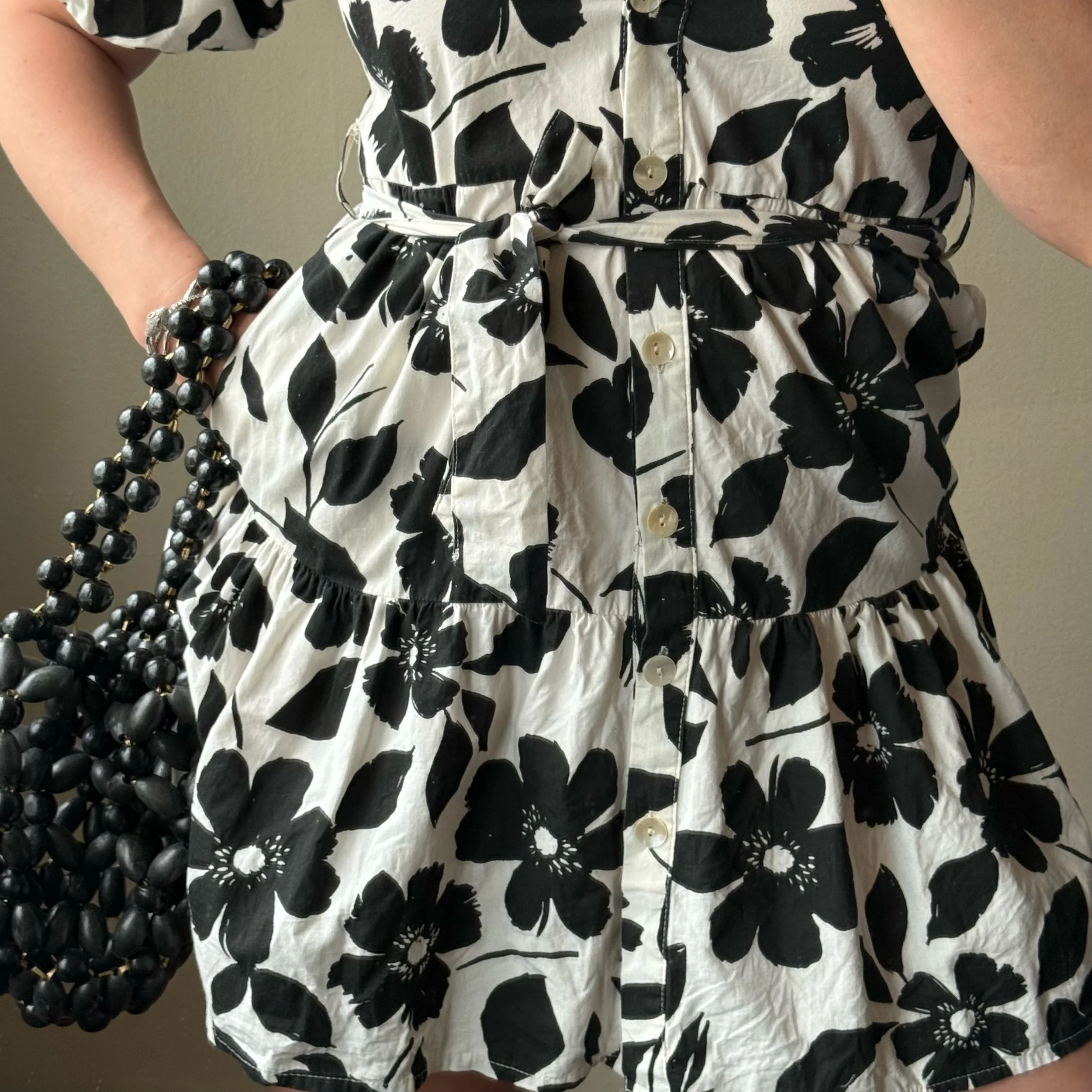 Jessica Simpson tiered white & black floral button down dress with puffed short sleeves and a belt that can be tied in the front or back.